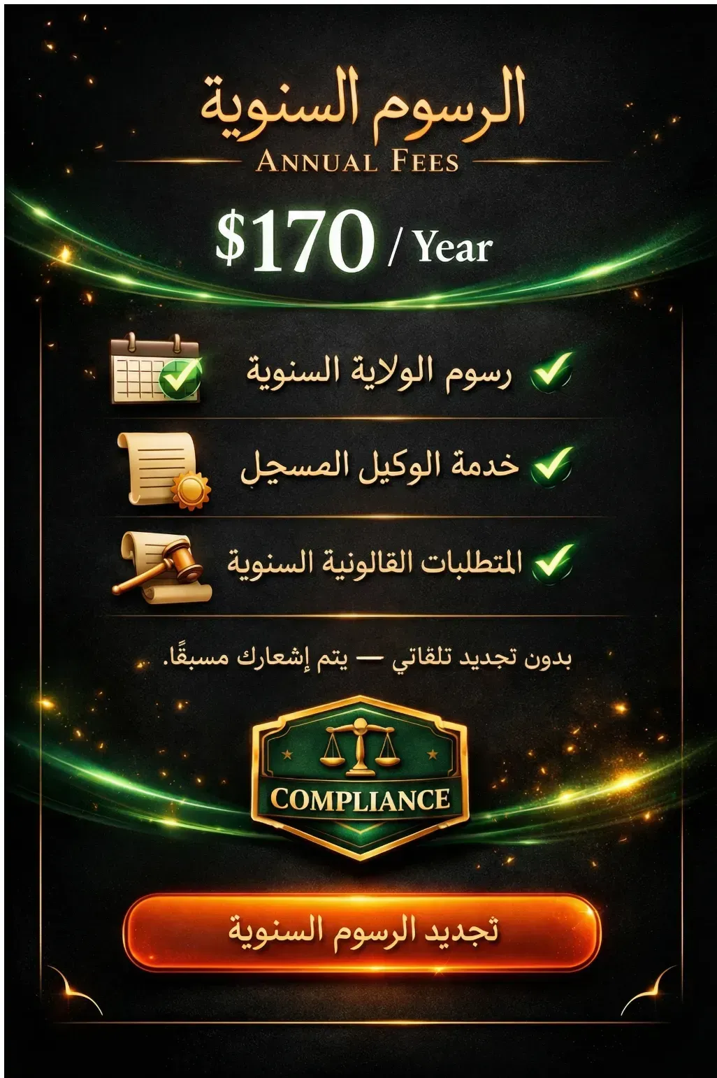 جميع رسوم الولاية، التأسيس، والوكيل المسجل مشمولة ومعلنة بوضوح داخل الباقة.